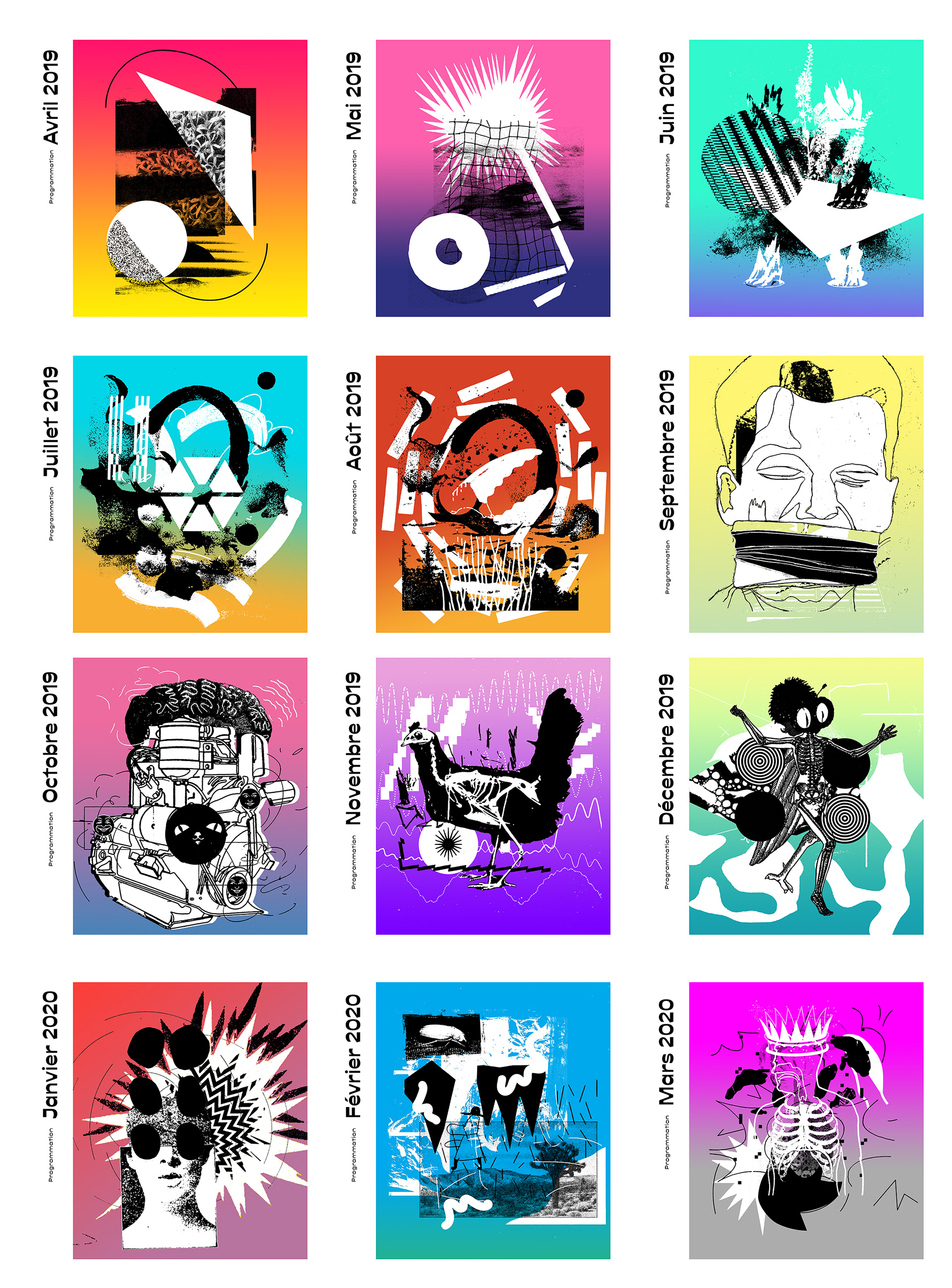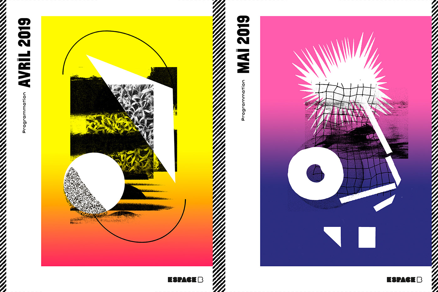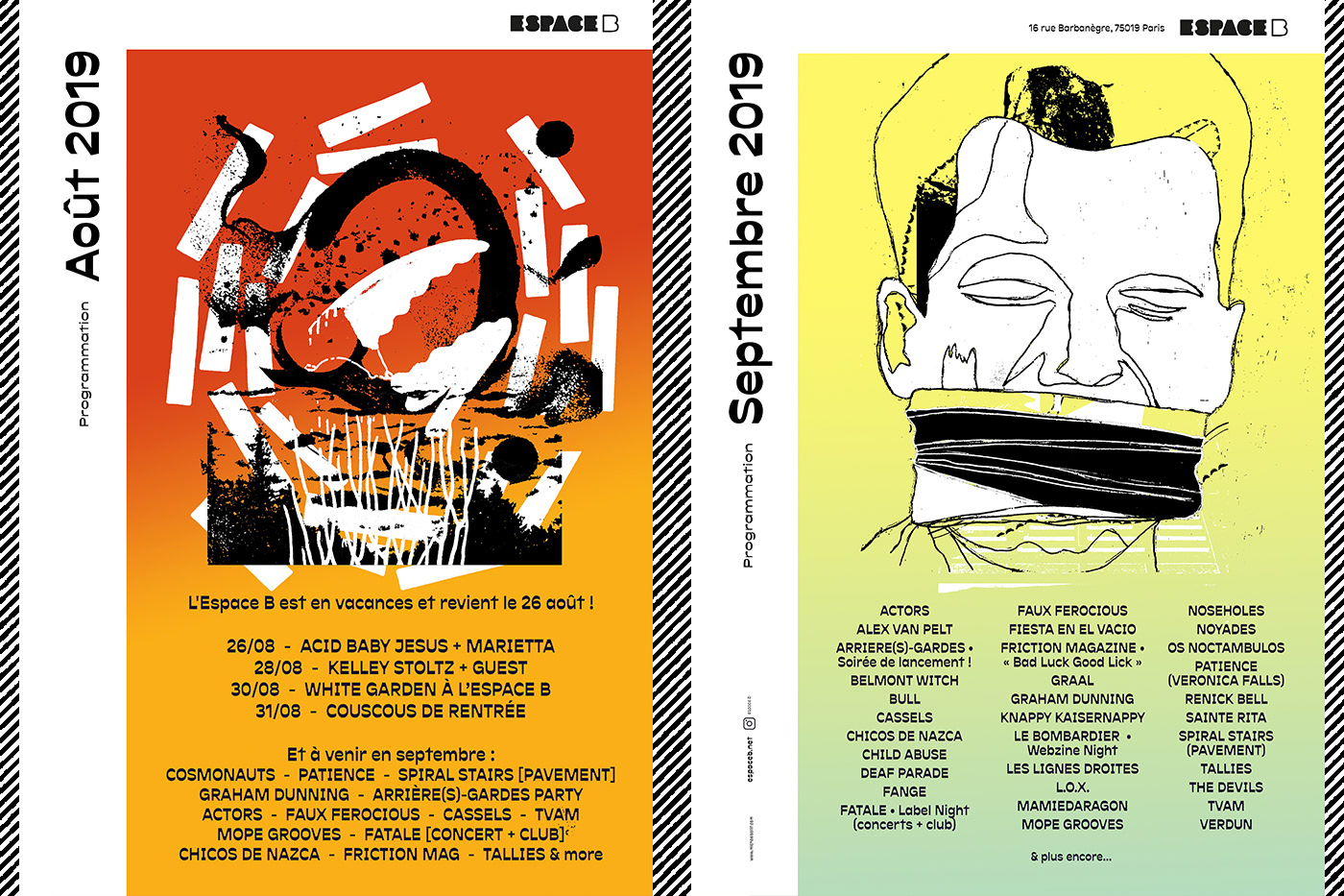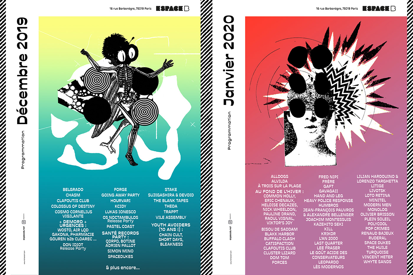 Visuals for Espace B (concert venue in Paris) programs and flyers.
